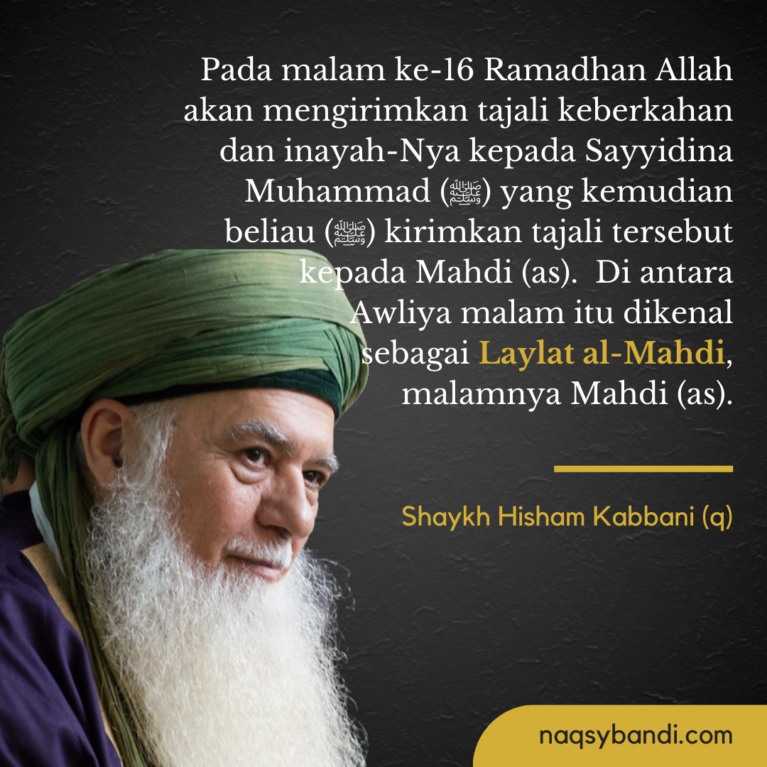 Pada malam ke-16 Ramadhan dalam Shalat al-Witir kita akan membaca Doa Qunut, di mana pada malam itu Allah yatajalla `alaa nabiyyihi – Allah akan mengirimkan tajali keberkahan dan inayah-Nya kepada Sayyidina Muhammad (saw) yang kemudian Nabi (saw) mengirimkan tajali tersebut kepada Mahdi (as). Di antara para Awliya malam itu dikenal sebagai Laylat al-Mahdi, malamnya Mahdi (as), di mana dengan dukungan Surgawi pada malam itu, Allah bukakan tajali dan inayah khusus, inayatihi al-khassah. Dia bukakan untuk Mahdi (as) beserta khalifah dan deputinya. Pada malam itu Mahdi (as) akan memimpin tarawih bersama 40 khalifah dan 59 deputinya serta 12.000 keturunan Sayyidina `Ali (ra).