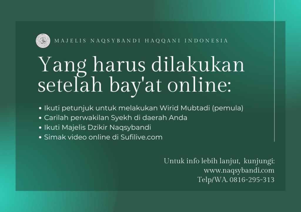 Selamat atas bay’at yang telah Anda lakukan. Insya Allah bay’at itu diterima oleh Mawlana Syekh Nazim. Kami merekomendasikan agar Anda tetap memelihara hubungan dengan Mawlana Syekh Nazim dan Khalifahnya, Syekh Muhammad Hisyam Kabbani melalui website sufilive.com atau http://www.naqshbandi.org atau http://www.naqsybandi.org
